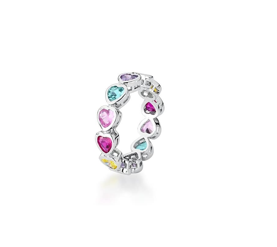 ANEL COM CRAVAÇÃO DE CORAÇÕES COLORIDOS BANHADO A RÓDIO BRANCO