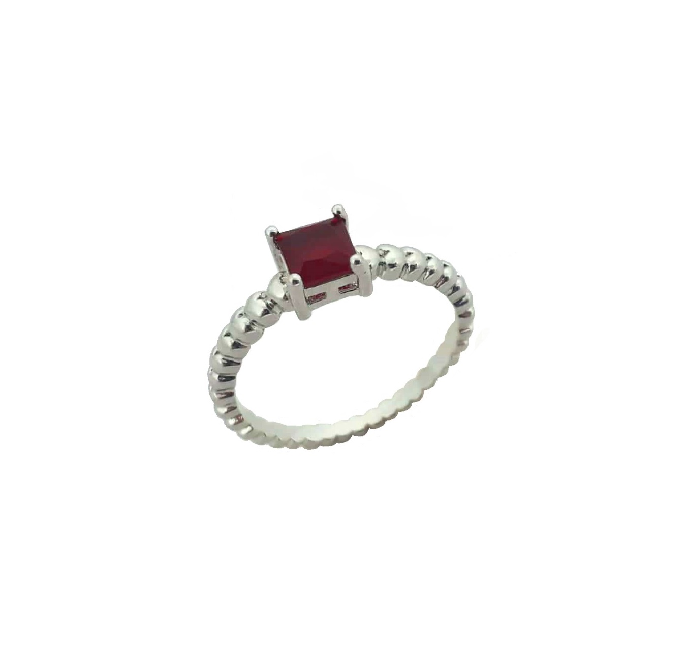ANEL COM PEDRA QUADRADA RUBI BANHADO A RÓDIO BRANCO