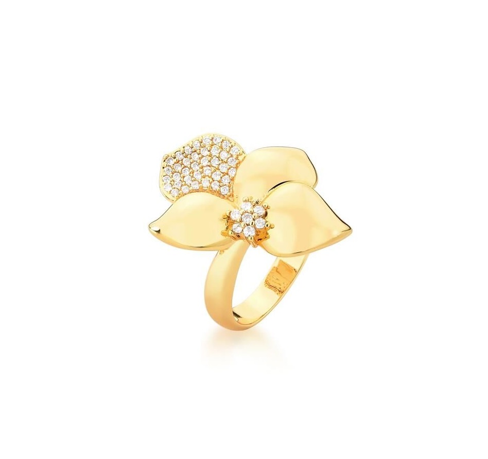 ANEL FLOR COM PÉTALA CRAVEJADA BANHADO A OURO