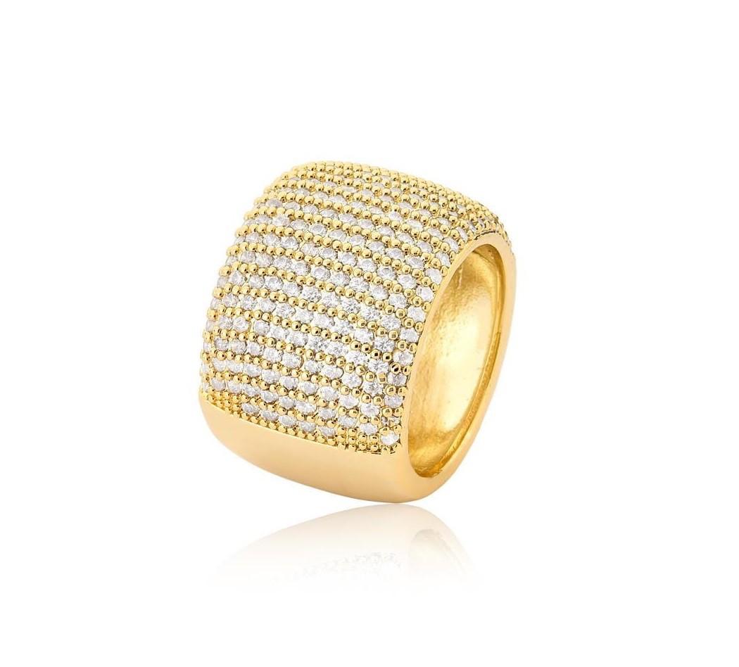 ANEL LARGO COM CRAVAÇÃO FRONTAL DE MICROZIRCÔNIAS BANHADO A OURO