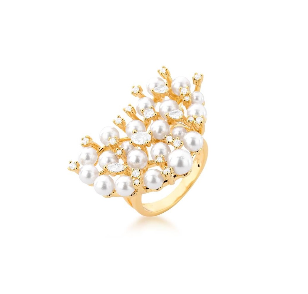 ANEL MAXI CORAÇÃO EM PÉROLAS E PONTOS DE ZIRCÔNIAS BANHADO A OURO