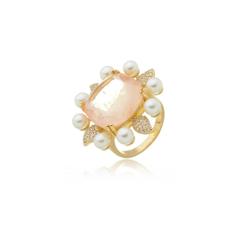 ANEL MORGANITA COM PÉROLAS BANHADO A OURO