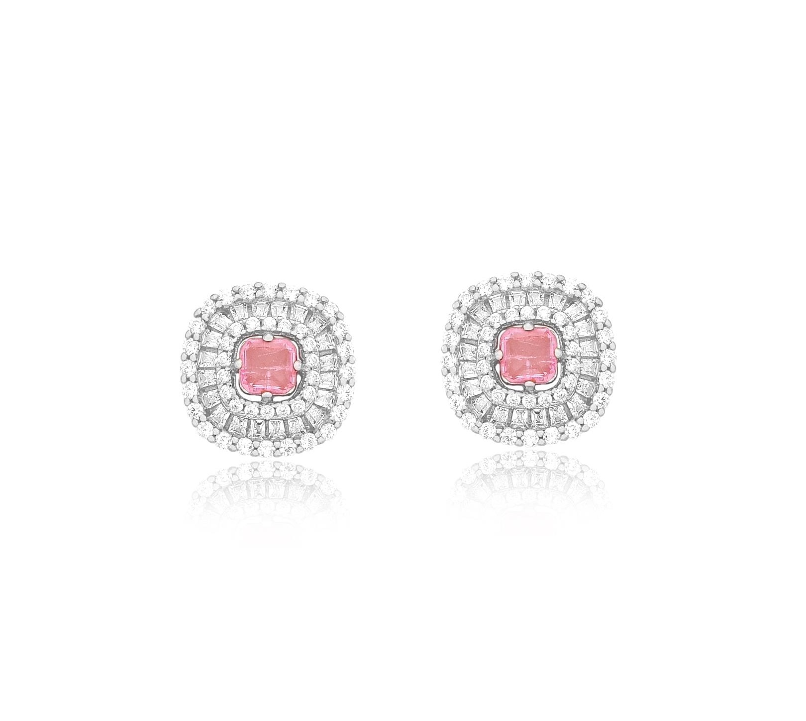 BRINCO COM PEDRA LIGHT PINK E BAGUETES LATERAIS BANHADO A RÓDIO BRANCO