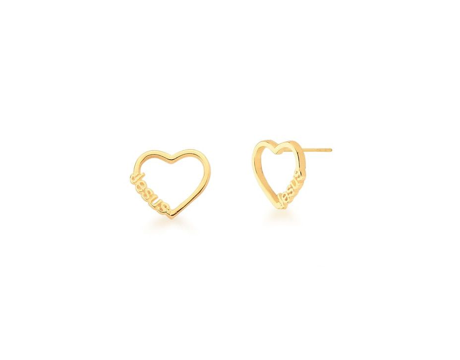 BRINCO CORAÇÃO VAZADO COM ESCRITA JESUS BANHADO A OURO