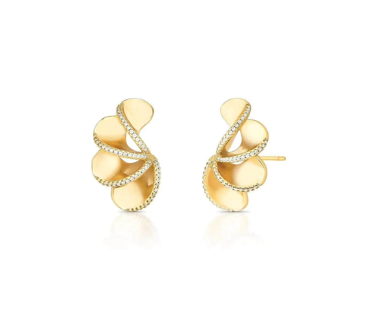 BRINCO CURVO DE FLOR TRABALHADO COM ZIRCÔNIAS BANHADO A OURO