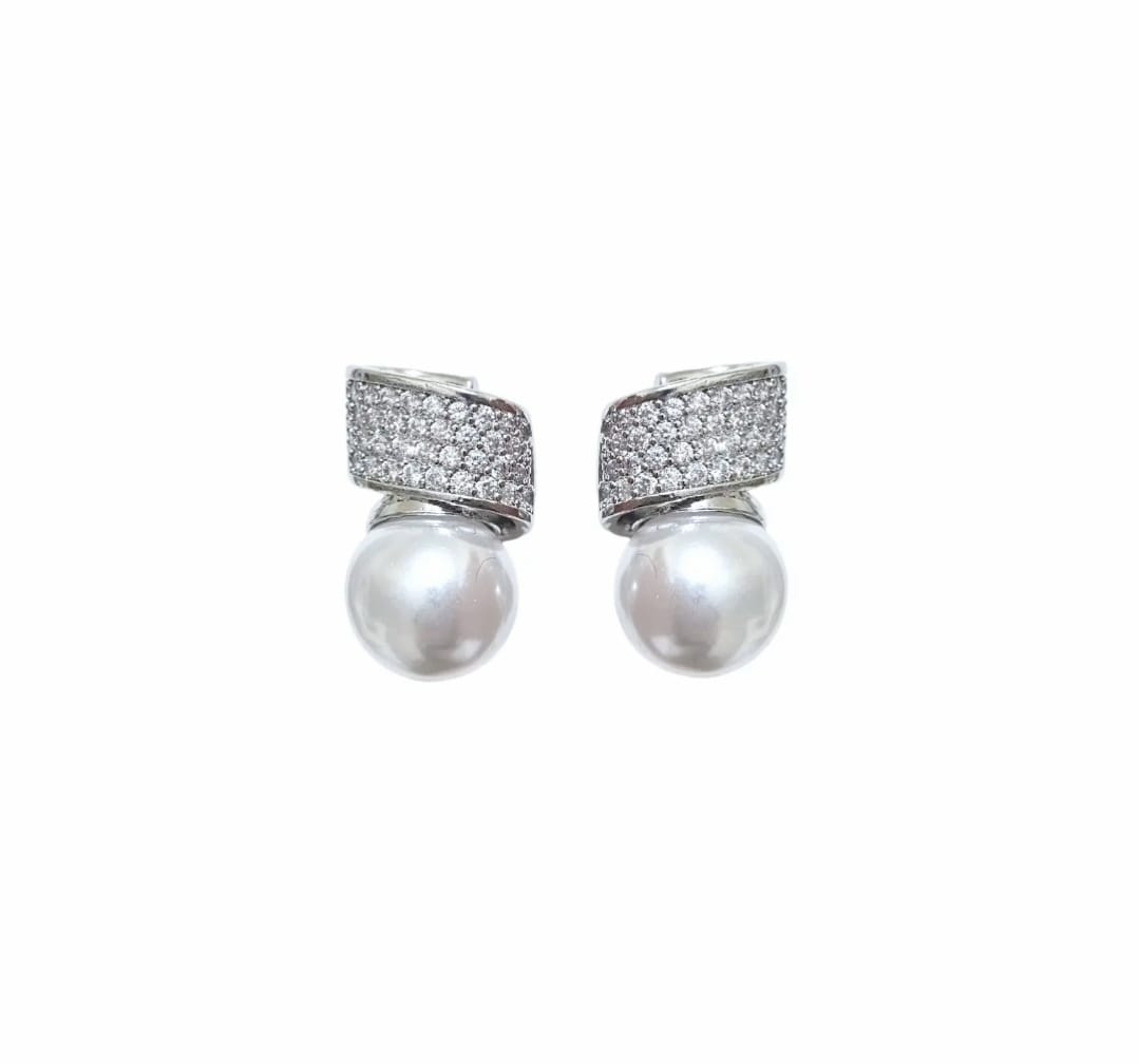 BRINCO DE PÉROLA BASE CURVA CRAVEJADA BANHADO A RÓDIO BRANCO