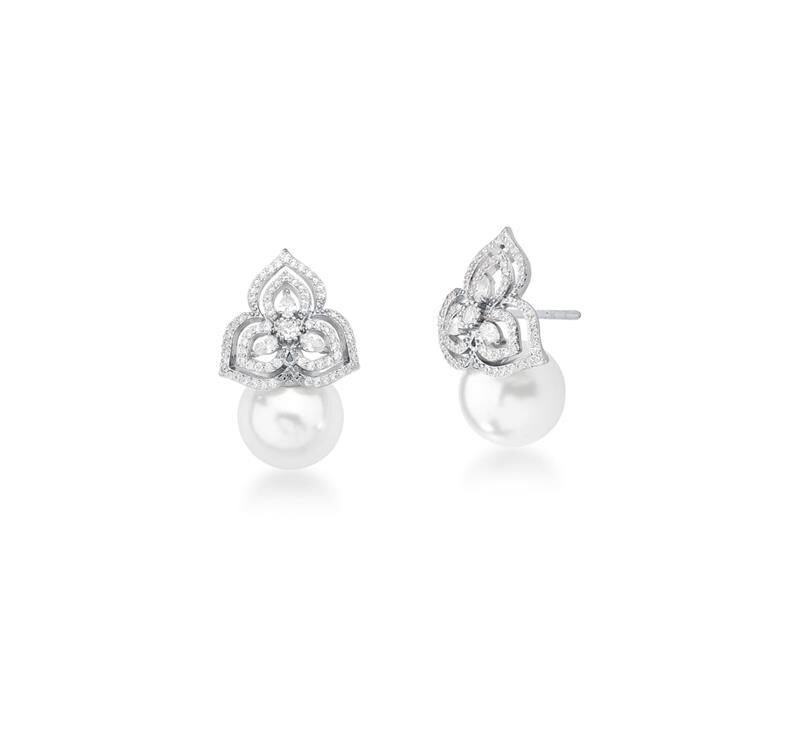 BRINCO DE PÉROLA COM BASE DE FLOR CRAVEJADA BANHADO A RÓDIO BRANCO