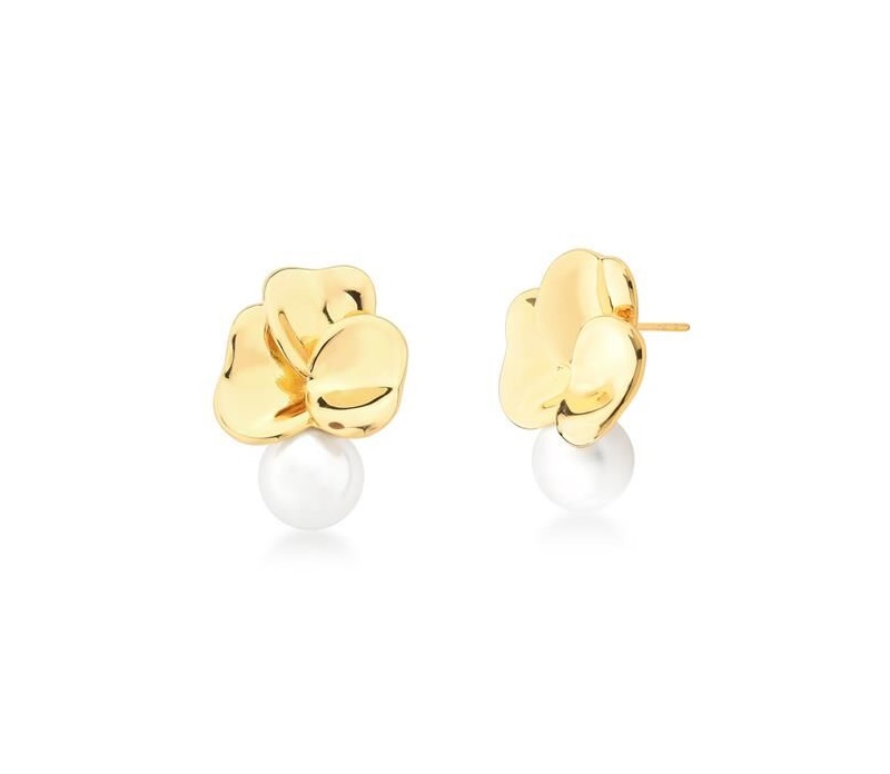 BRINCO DE PÉROLA COM BASE FLOR LISA BANHADO A OURO