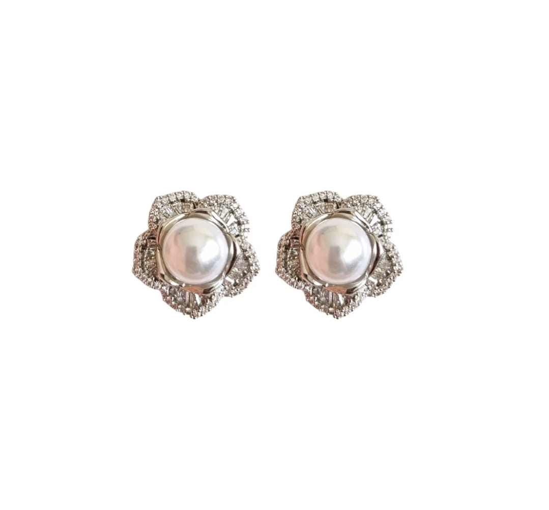 BRINCO DE PÉROLA FLOR COM CRAVAÇÃO LATERAL BANHADO A RÓDIO BRANCO