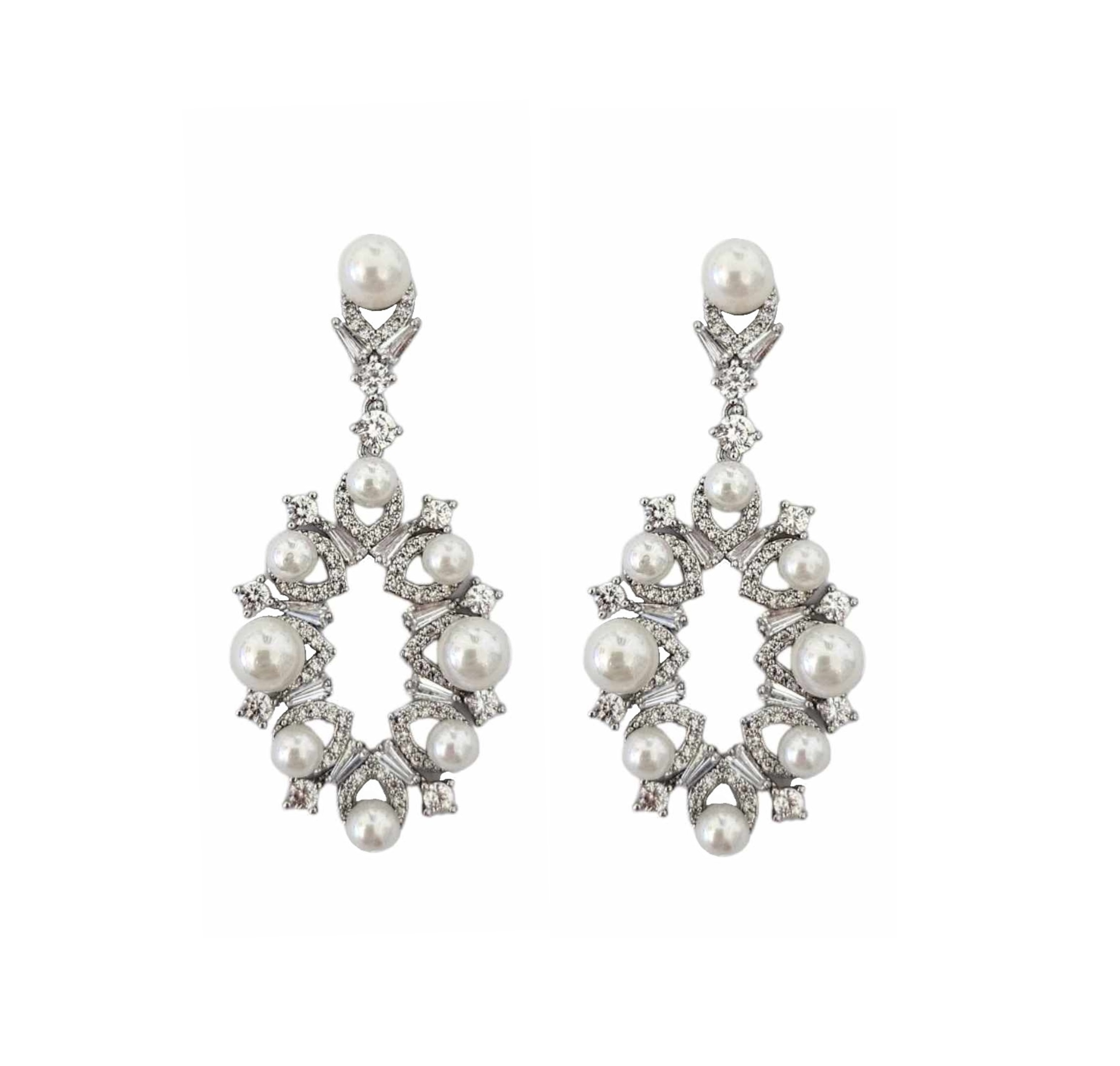 BRINCO EM PÊNDULO COM PÉROLAS E ZIRCÔNIAS BANHADO A RÓDIO BRANCO