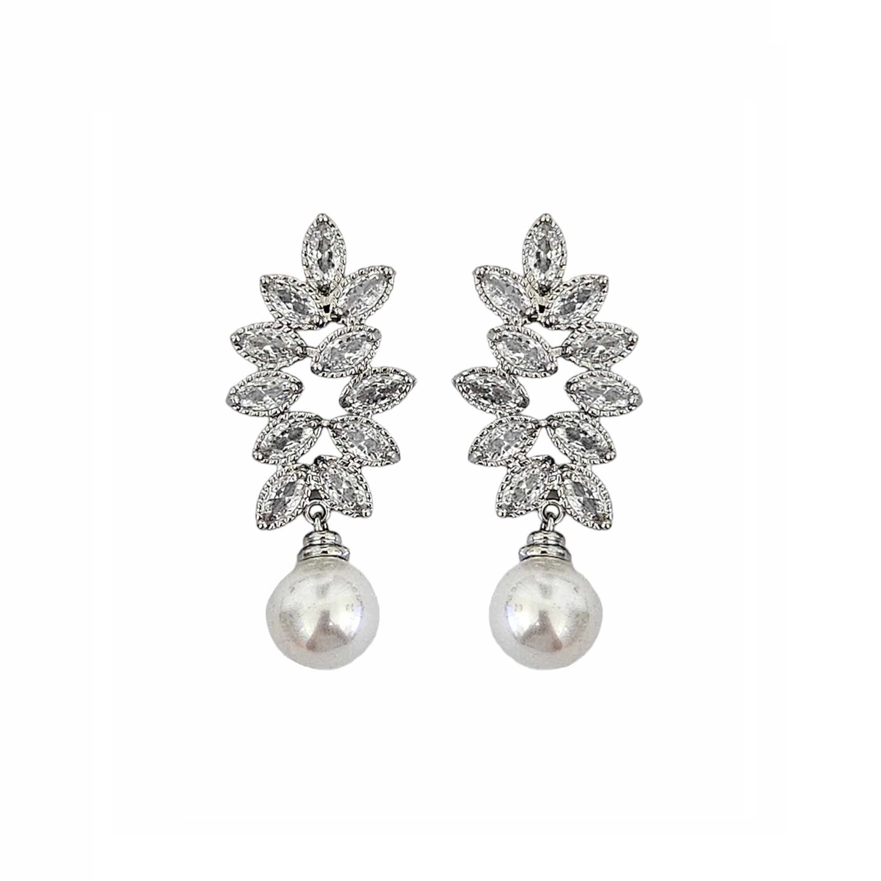 BRINCO FOLHAS CRAVEJADAS COM PÉROLA EM PÊNDULO BANHADO A RÓDIO BRANCO