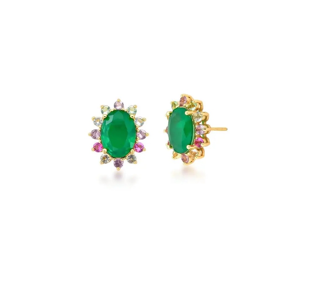 Brinco Oval Esmeralda Fusion com Cravação Lateral Colorida Banhado a Ouro