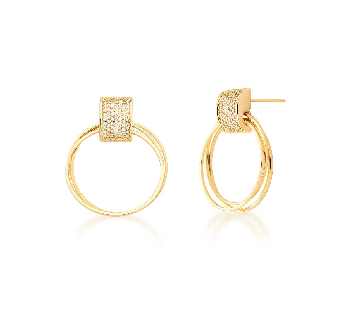 BRINCO PÊNDULO COM TRÊS ELOS E BASE CRAVEJADA BANHADO A OURO