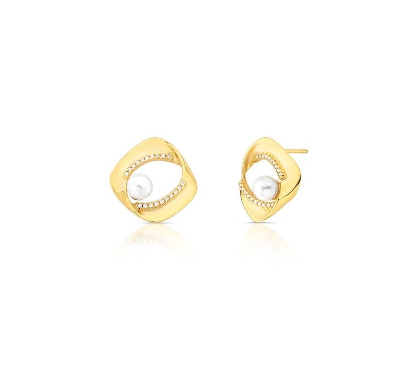 BRINCO QUADRADO VAZADO COM PÉROLA BANHADO A OURO
