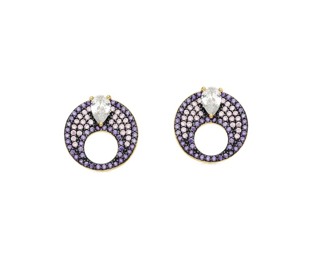 BRINCO REDONDO COM CRAVAÇÃO TANZANITA E GOTA CRISTAL BANHADO A OURO