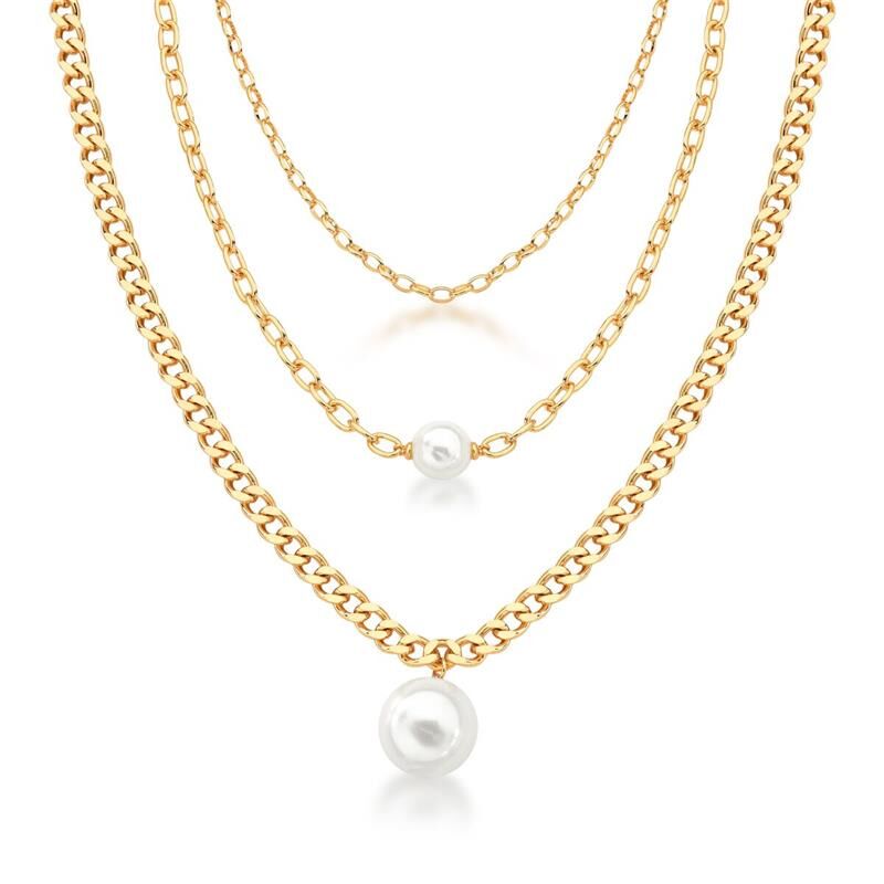 COLAR TRÊS VOLTAS COM ELOS LISOS E PÉROLAS BANHADO A OURO