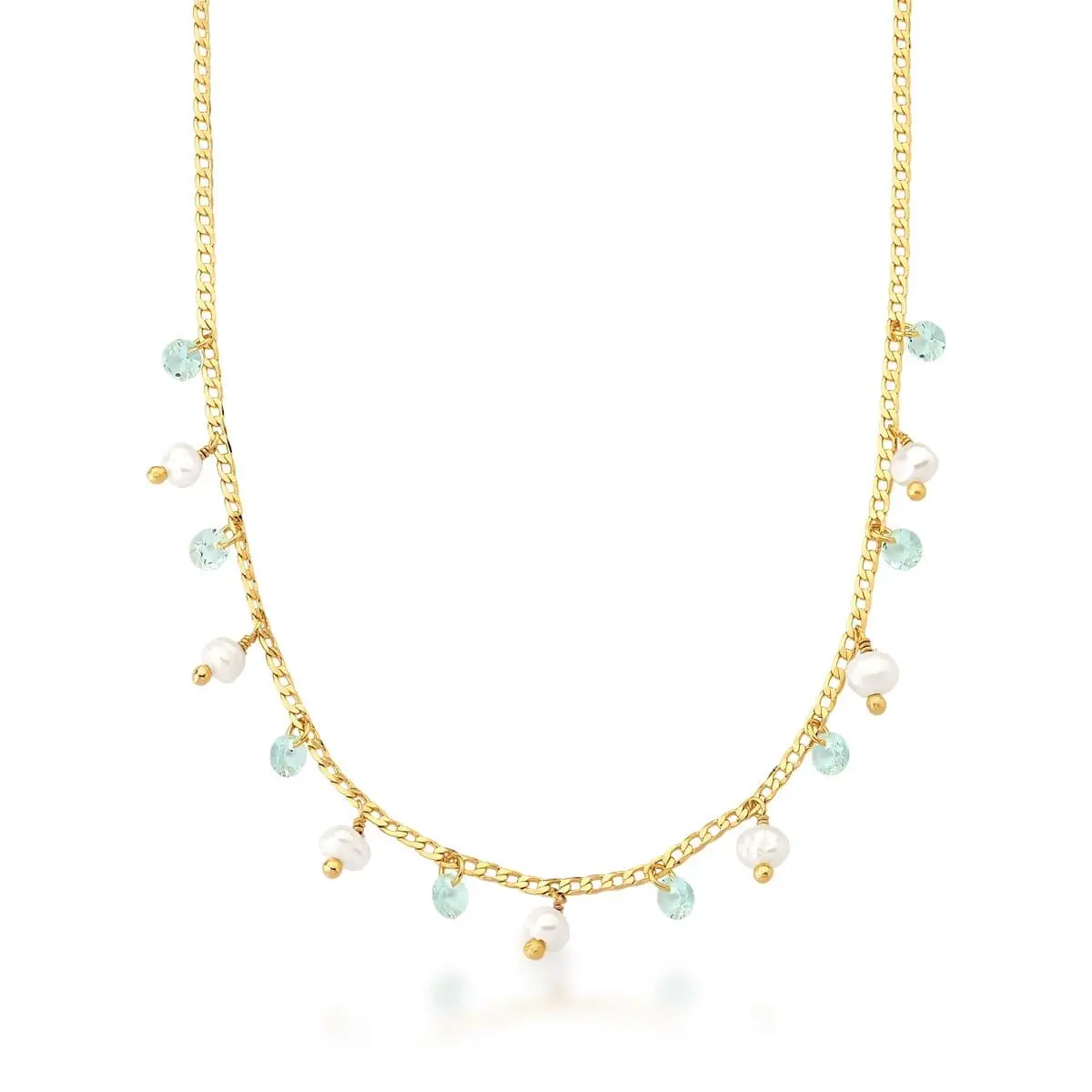 Colar com Cristais Água Marinha e Pérolas Banhado a Ouro