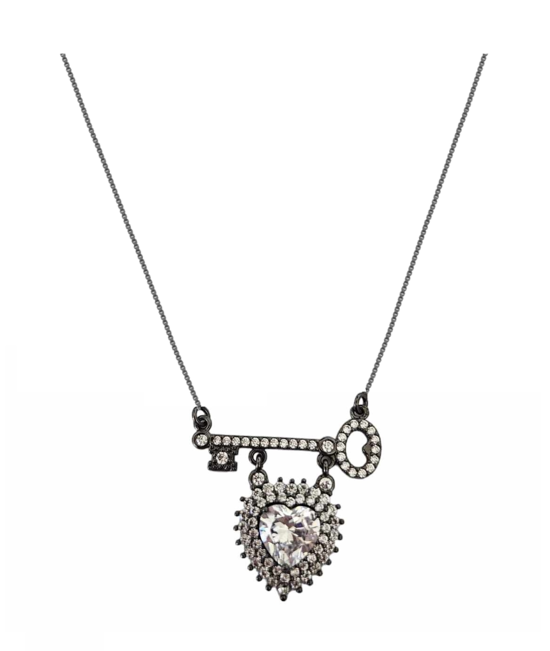 COLAR CORAÇÃO COLORS COM CHAVE BANHADO RÓDIO NEGRO