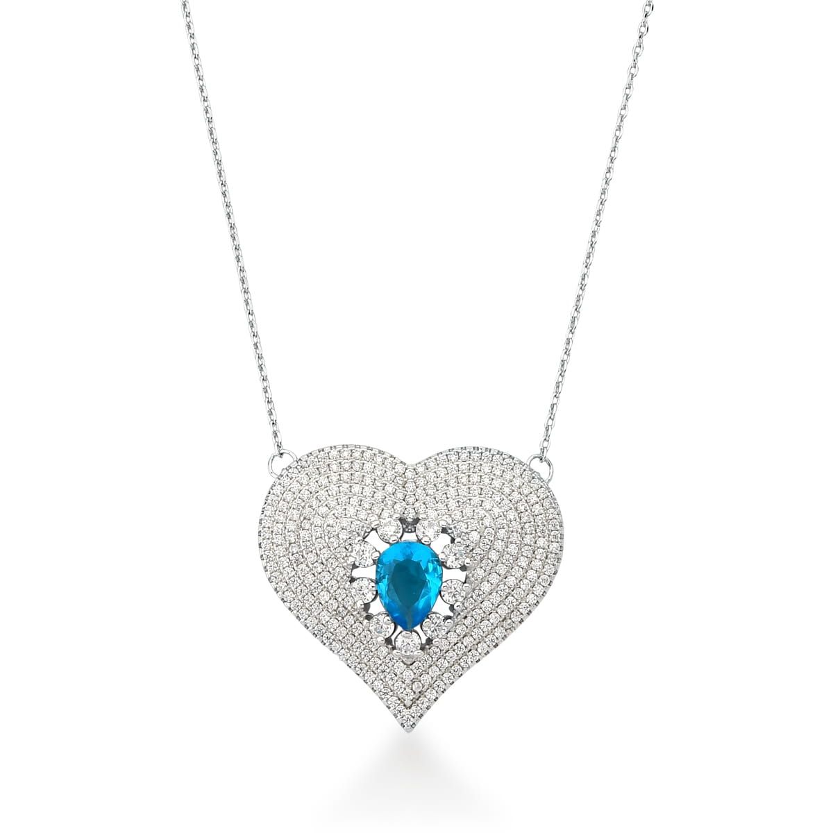 COLAR CORAÇÃO COM CENTRO AZUL E CRAVAÇÃO LATERAL CRISTAL BANHADO A RÓDIO