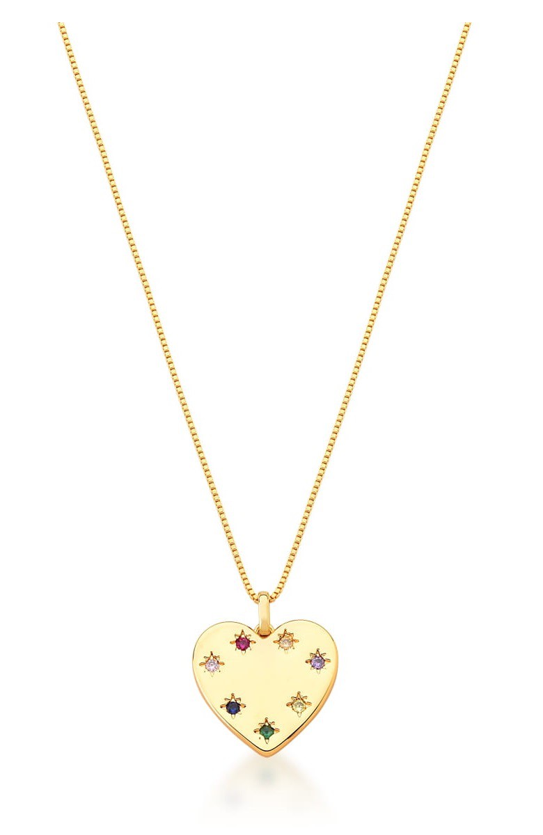 COLAR CORAÇÃO COM PONTOS DE LUZ COLORIDOS BANHADO A OURO