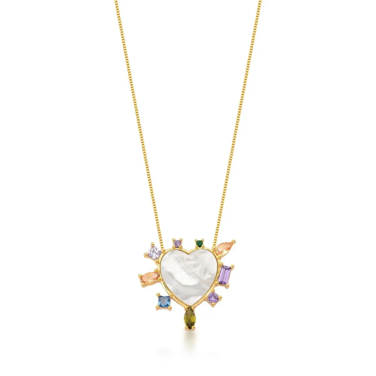 Colar Coração em Madrepérola com Cravação Lateral Colorida Banhado a Ouro