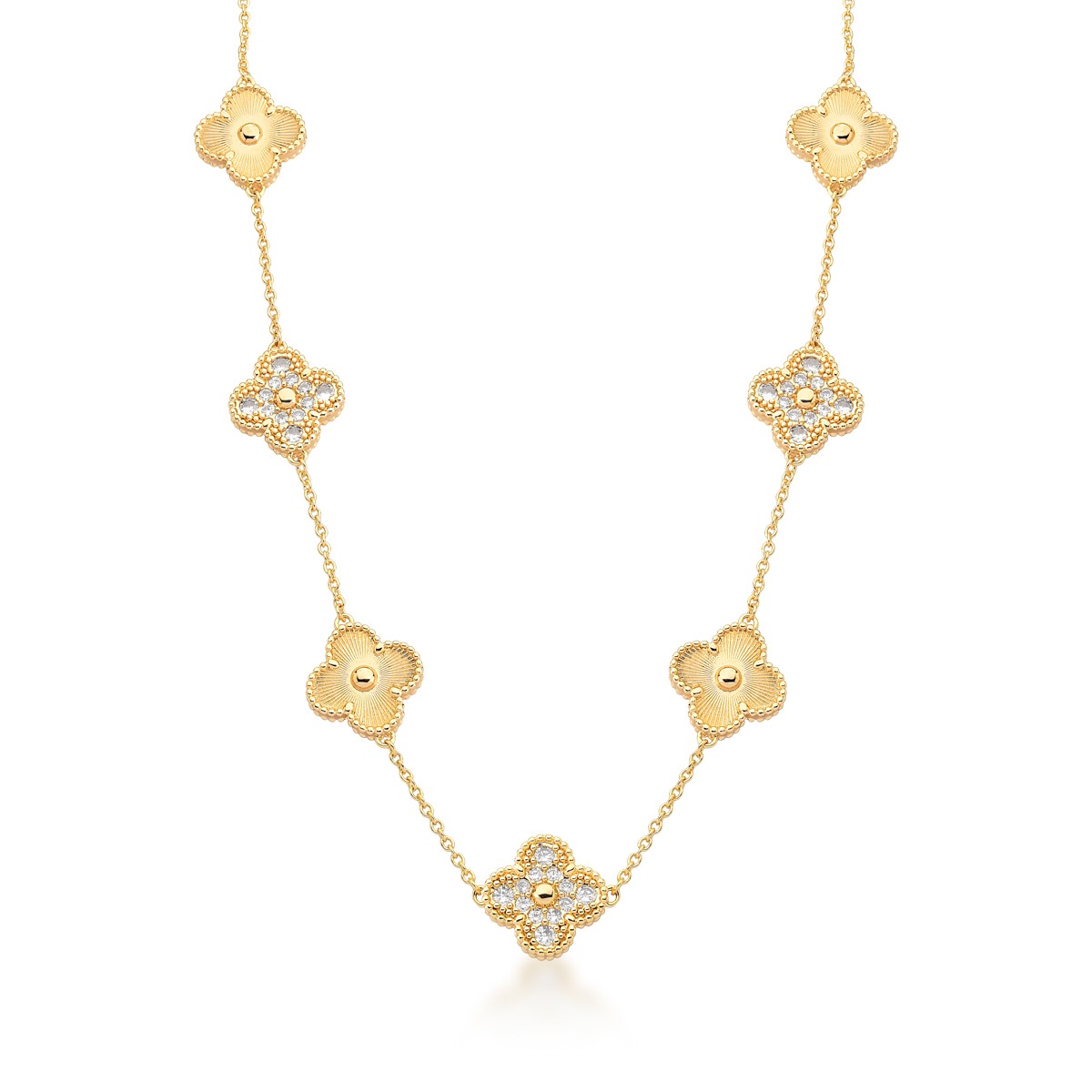 COLAR LONGO COM TREVOS CRAVEJADOS INTERCALADOS BANHADO A OURO