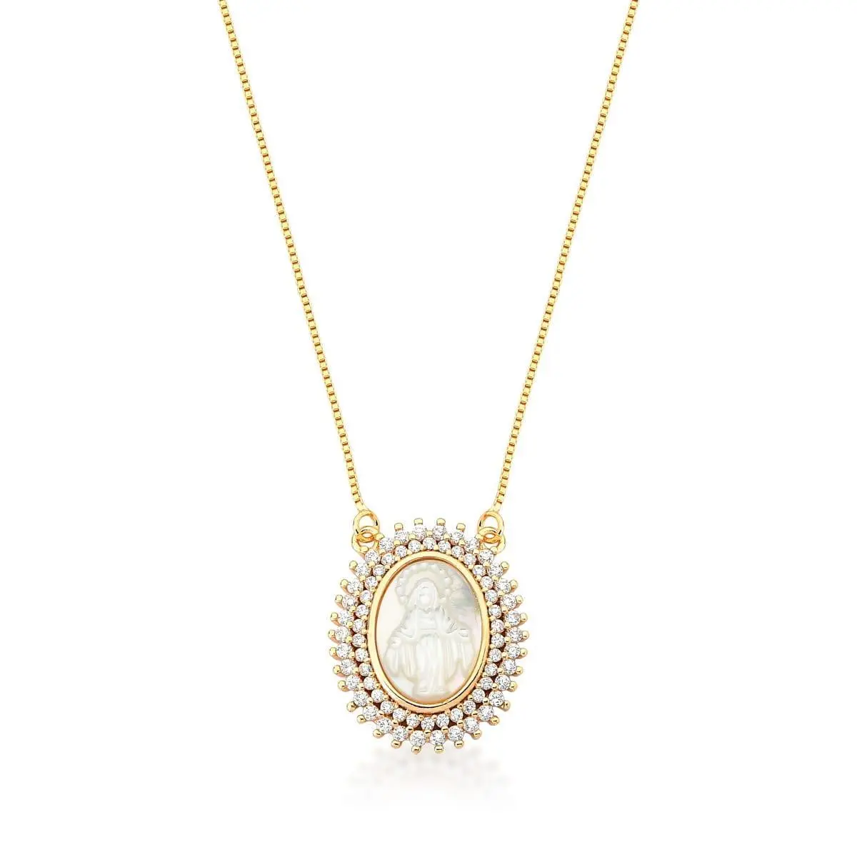 Colar Nossa Senhora das Graças em Madrepérola com Cravação Lateral Banhado a Ouro