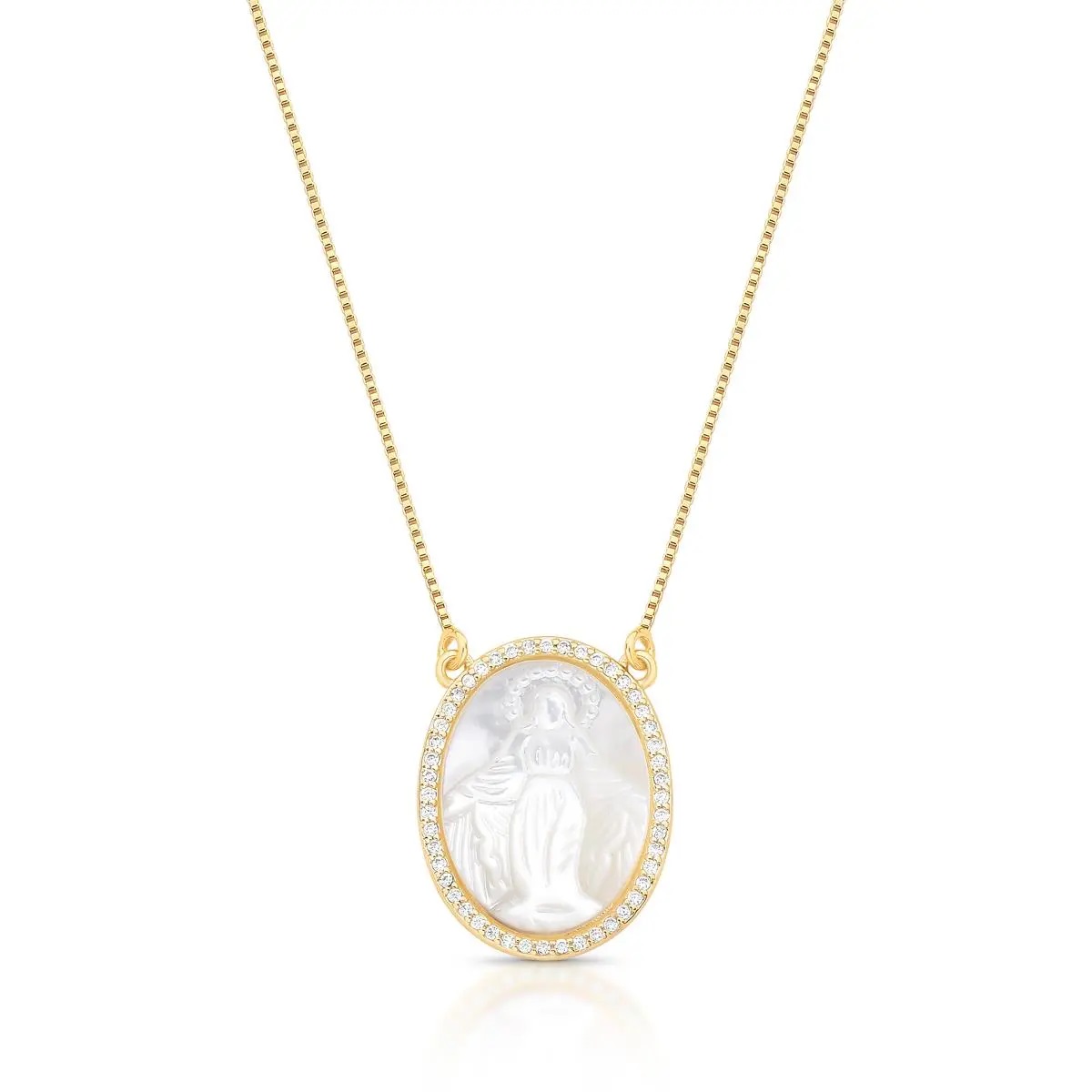 Colar Nossa Senhora das Graças Oval em Madrepérola com Cravação Lateral Banhado a Ouro
