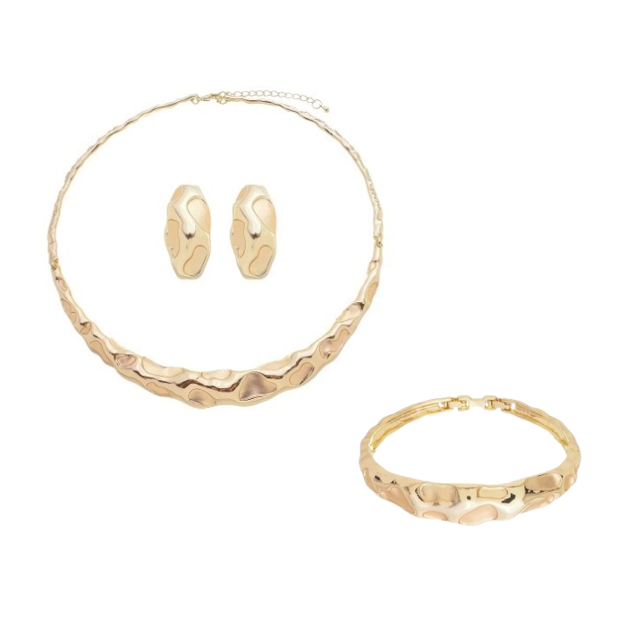CONJUNTO ARO, BRINCO E BRACELETE ORGÂNICOS COM DETALHES ACETINADOS BANHADO A OURO