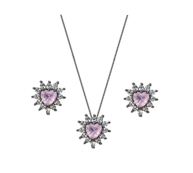 CONJUNTO CORAÇÃO EM ZIRCÔNIAS KUNZITA BANHADO A RÓDIO NEGRO