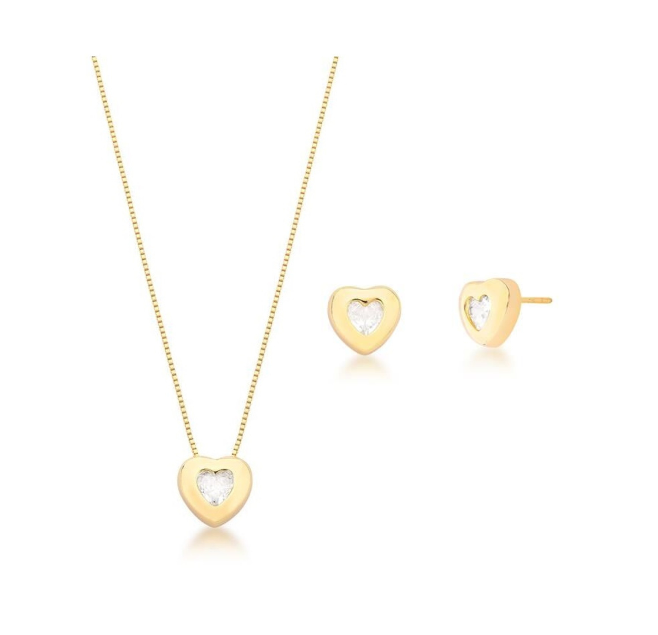 CONJUNTO CORAÇÃO LISO COM ZIRCÔNIA CENTRAL BANHADO A OURO