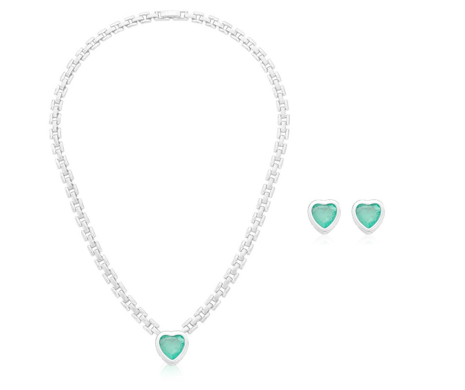 CONJUNTO CORAÇÃO TURMALINA FUSION BANHADO A RÓDIO BRANCO
