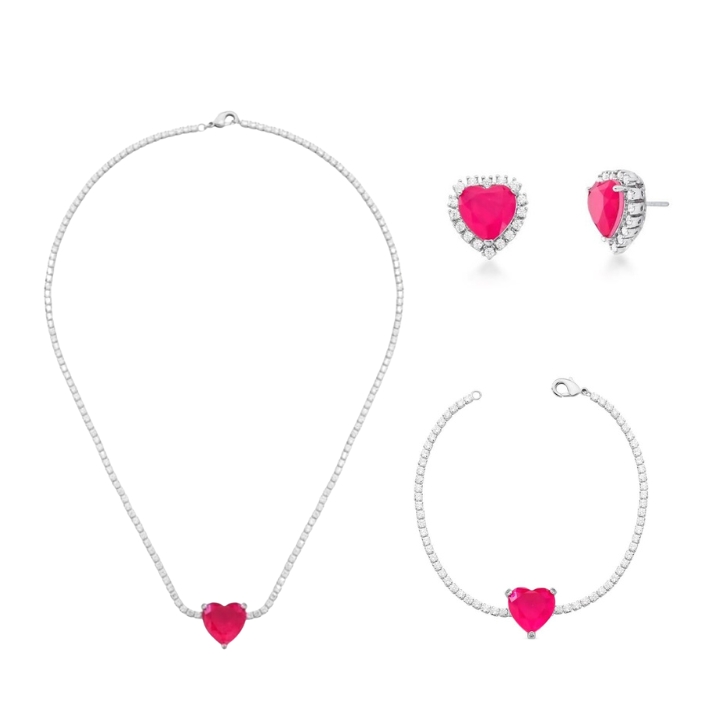 CONJUNTO CORAÇÃO TURMALINA ROSA BANHADO A RÓDIO BRANCO
