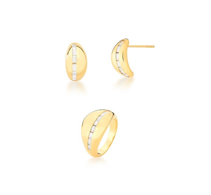 CONJUNTO DE BRINCO E ANEL COM UMA FILEIRA DE ZIRCÔNIAS BANHADO A OURO