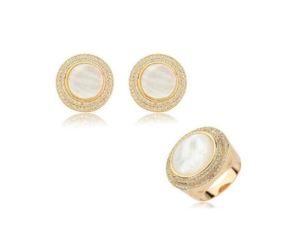CONJUNTO DE BRINCOS E ANEL EM MADREPÉROLA COM CRAVAÇÃO LATERAL BANHADO A OURO