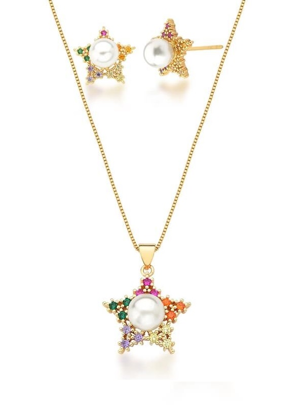 CONJUNTO DE ESTRELA COLORIDA COM PÉROLA CENTRAL BANHADO A OURO