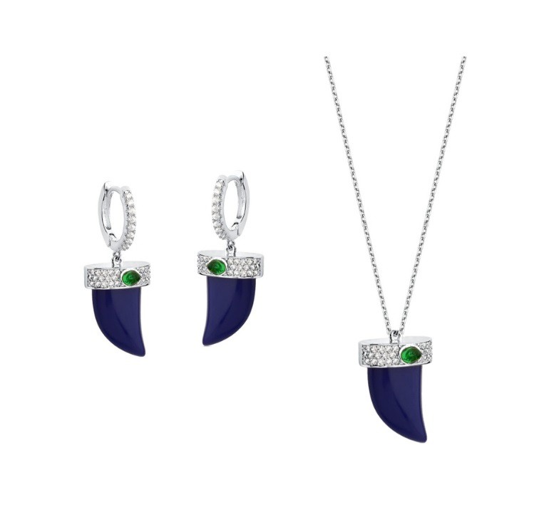 CONJUNTO DENTE DE SABRE AZUL CRAVEJADO BANHADO A RÓDIO BRANCO