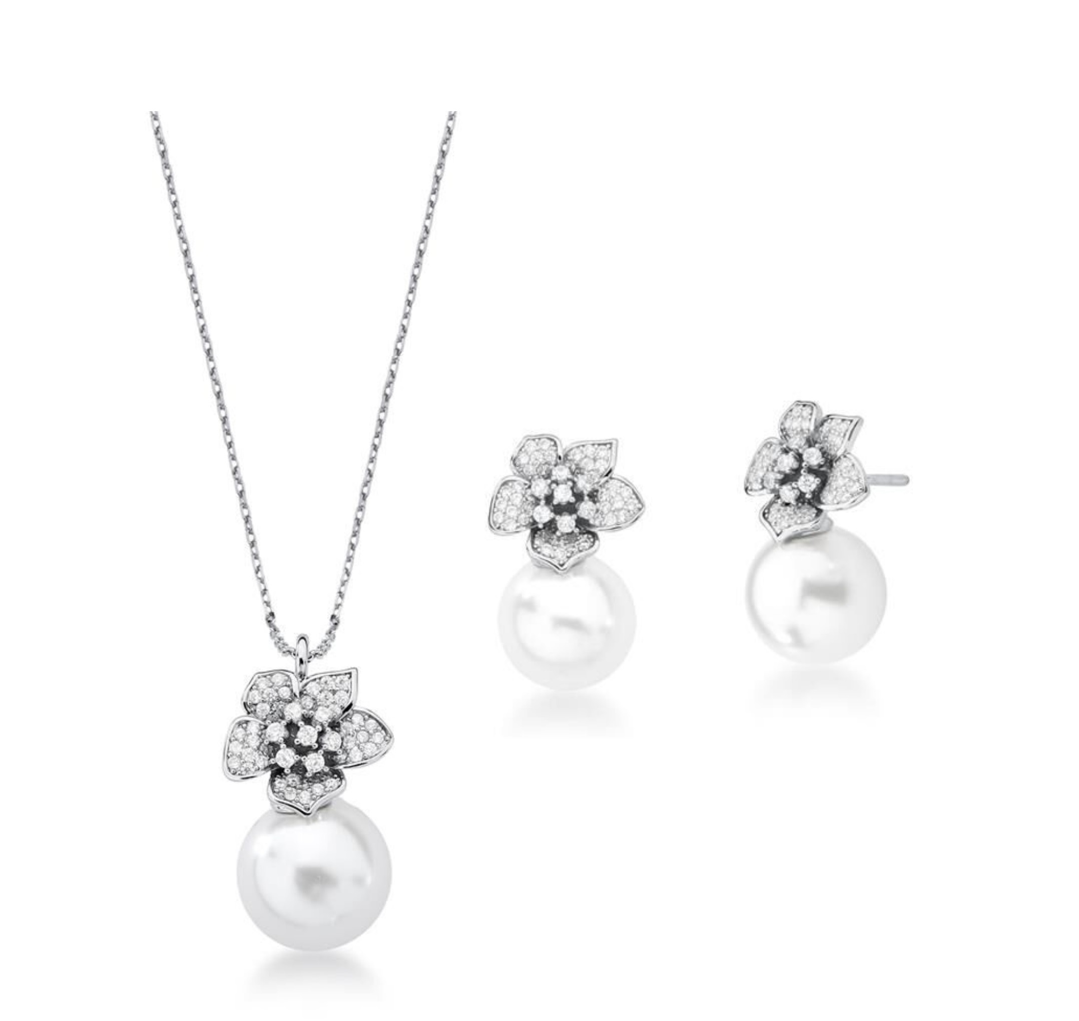 CONJUNTO FLOR CRAVEJADA COM PÉROLA BANHADO A RÓDIO BRANCO
