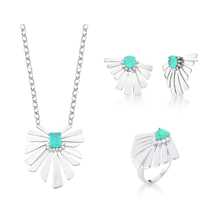 CONJUNTO FOLHAS COM PEDRA TRIANGULAR TURMALINA BANHADO A RÓDIO BRANCO