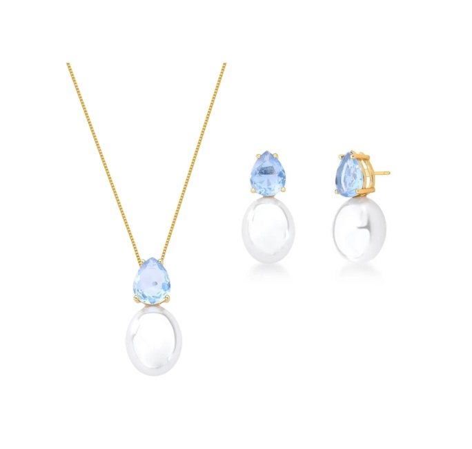 CONJUNTO GOTA AZUL COM PÉROLA SHELL BANHADO A OURO