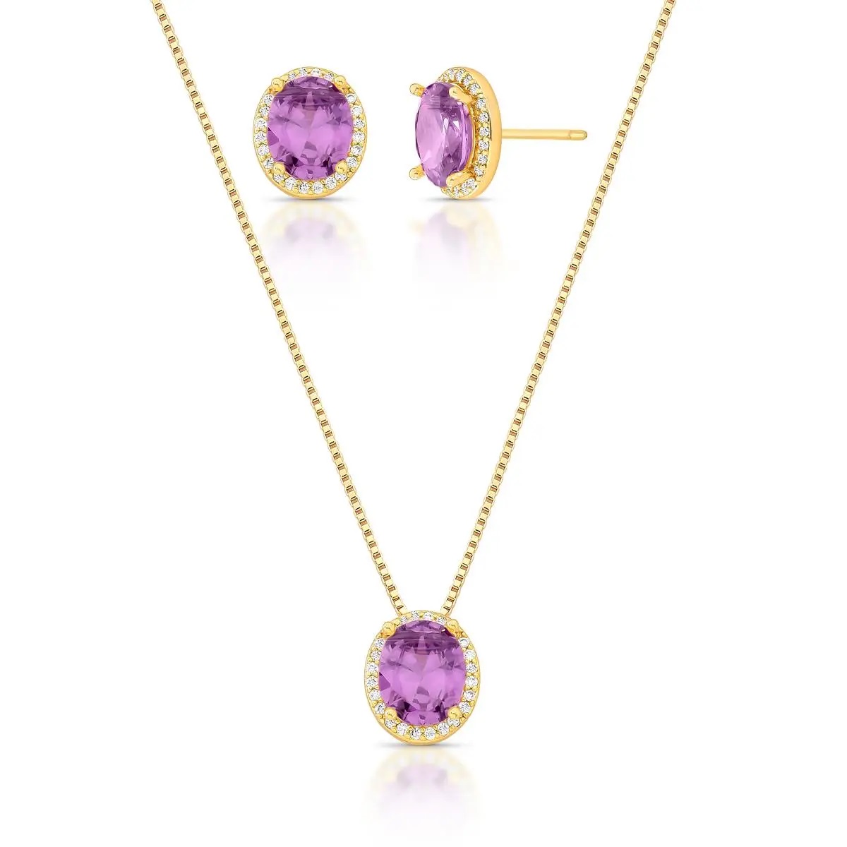 CONJUNTO OVAL TANZANITA COM CRAVAÇÃO LATERAL BANHADO A OURO