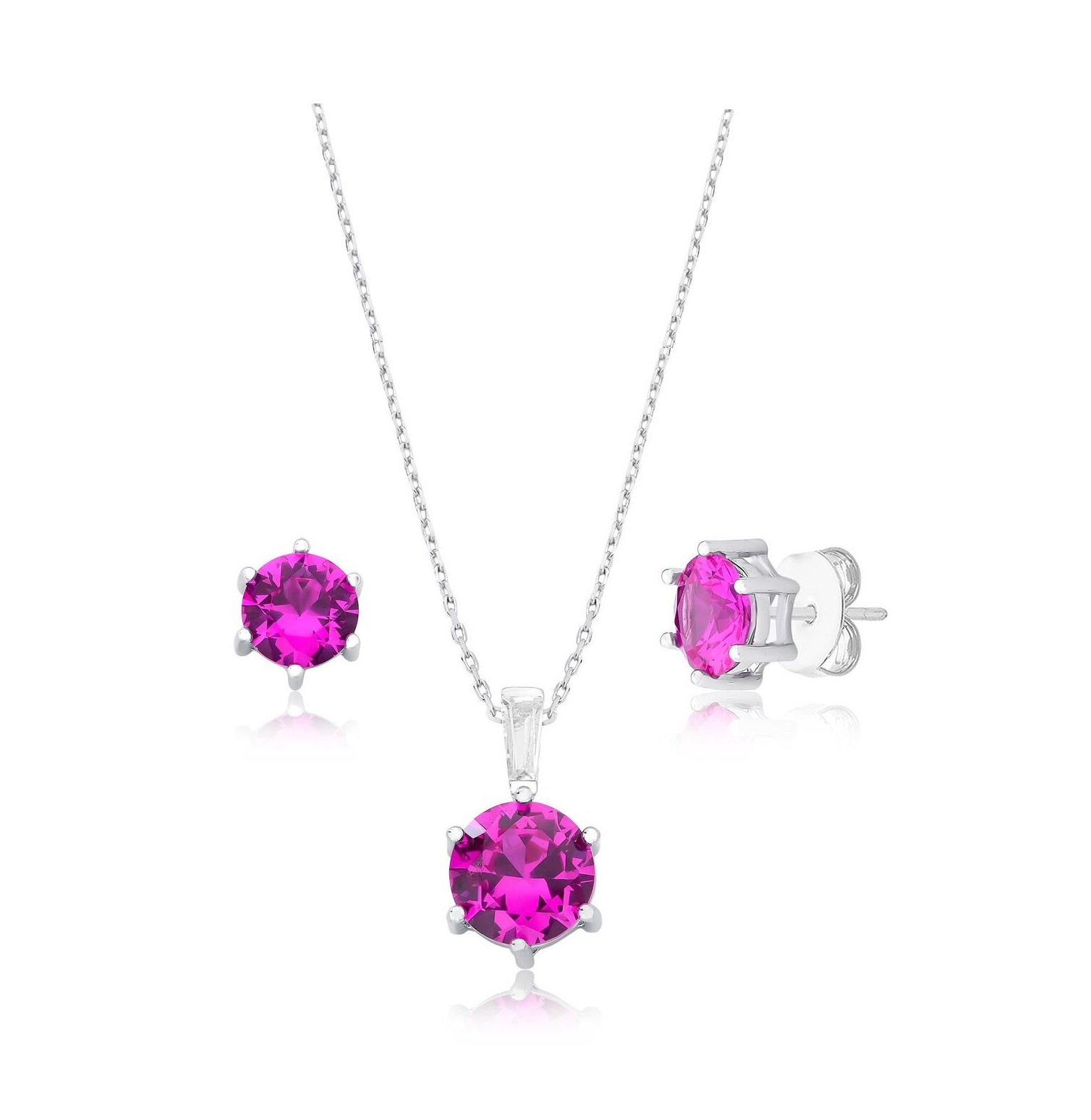 CONJUNTO REDONDO SAFIRA ROSA BANHADO A RÓDIO BRANCO