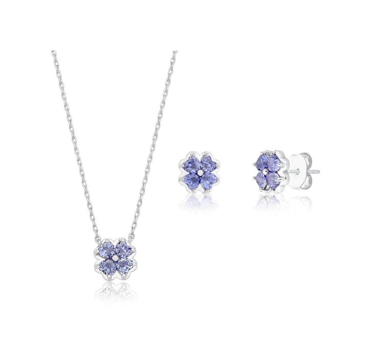 CONJUNTO TREVO TANZANITA BANHADO A RÓDIO BRANCO
