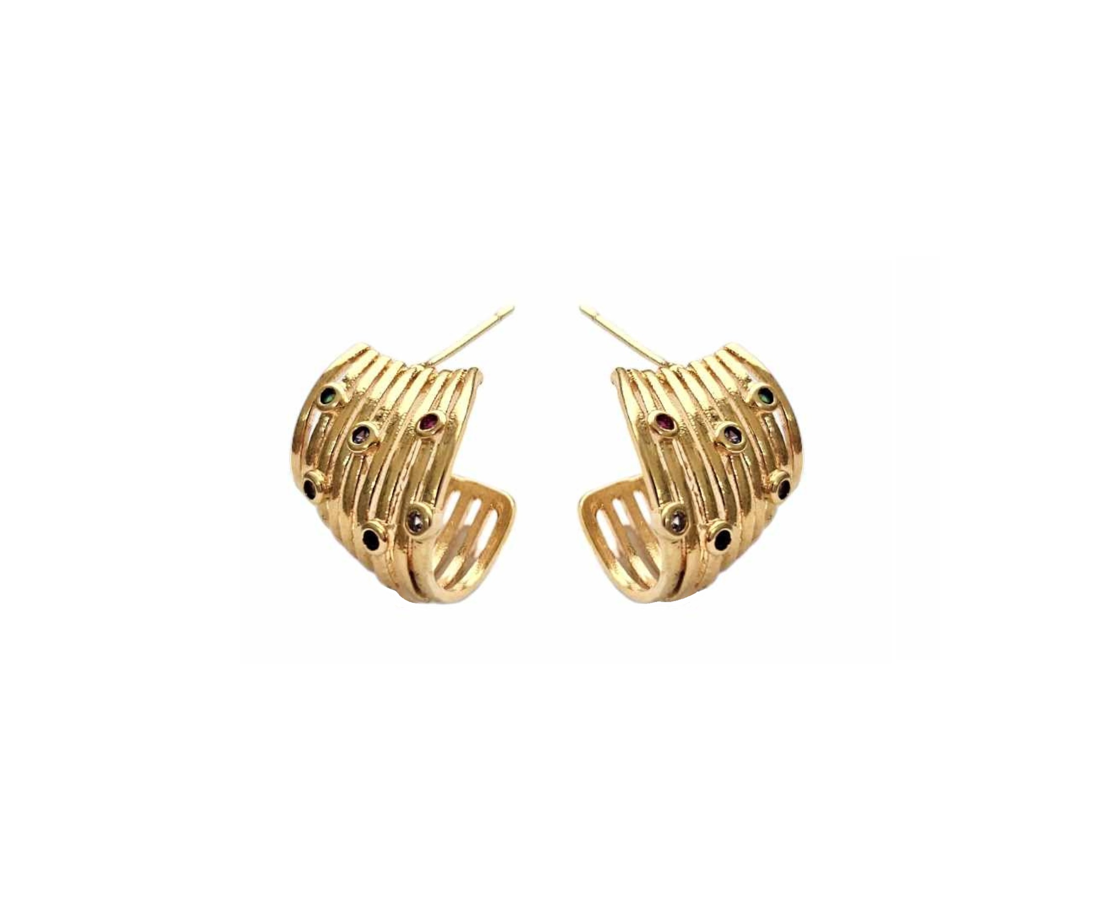 MEIA ARGOLA COM PONTOS DE ZIRCÔNIAS COLORIDOS BANHADA A OURO