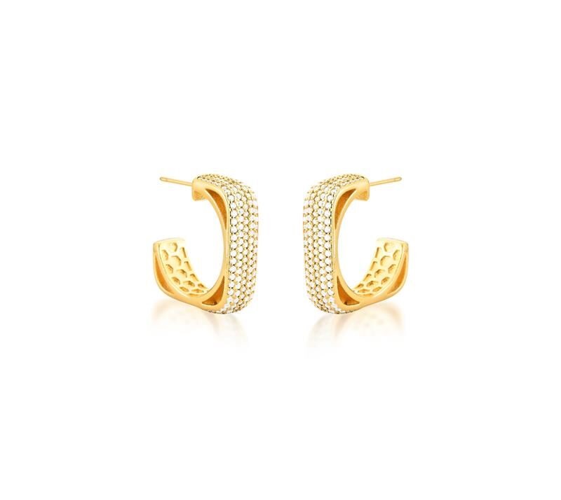 MEIA ARGOLA QUADRADA COM CRAVAÇÃO FRONTAL BANHADA A OURO