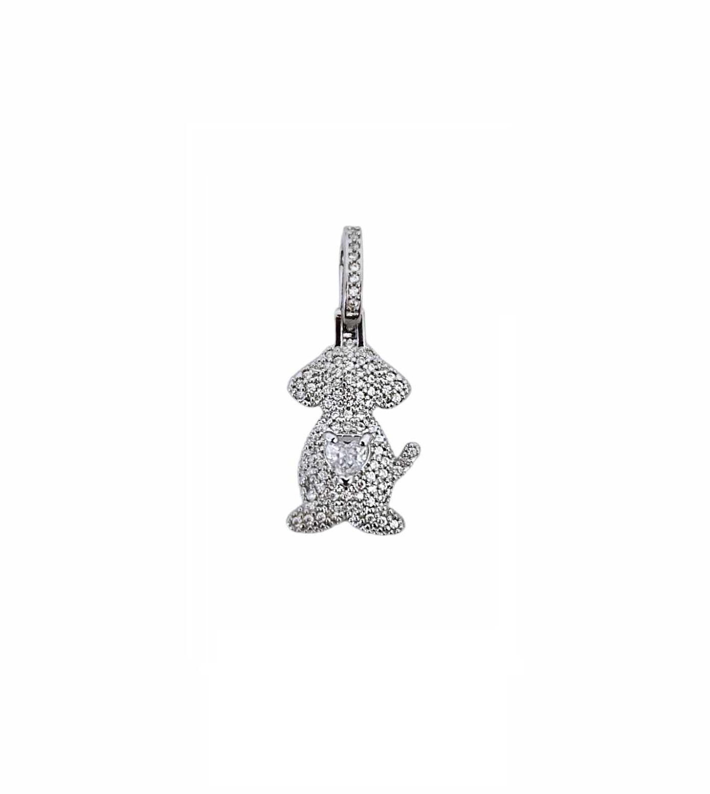 PINGENTE CACHORRO CRISTAL COM ABERTURA NA CONTRARGOLA BANHADO A RÓDIO BRANCO