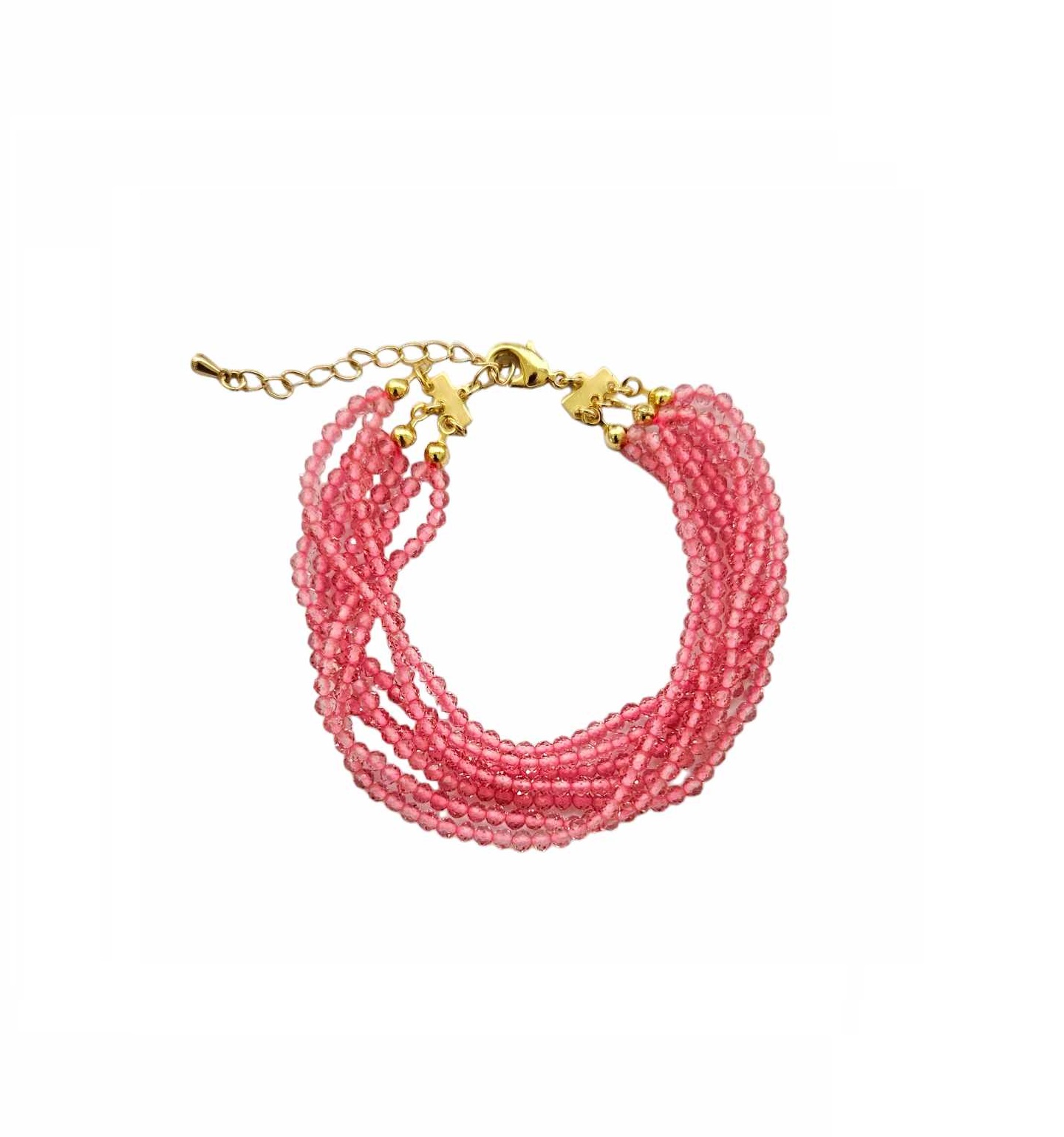 PULSEIRA COM SETE FILEIRAS DE CRISTAIS ROSA BANHADA A OURO